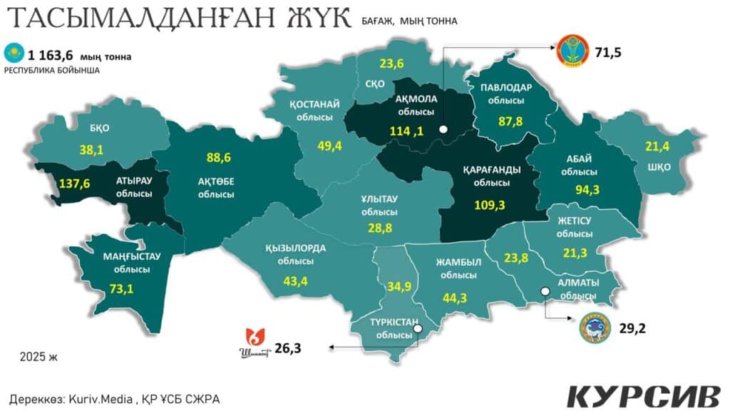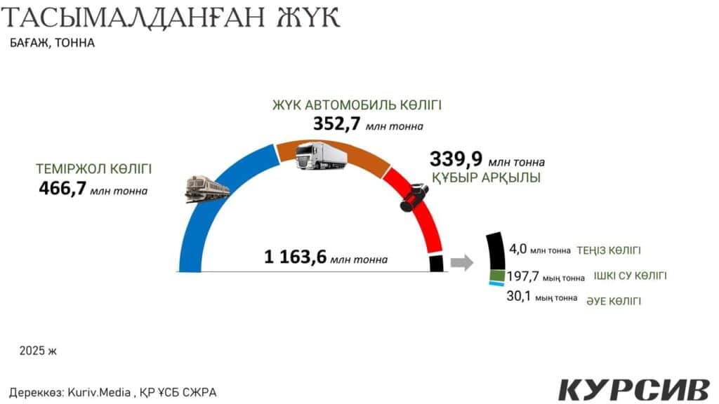 2025 жылы Қазақстан бойынша тасымалданған жүк көлемі 1 163,6 млн тоннаға жетті. Бұл – соңғы жылдардағы ең жоғары деңгейлердің бірі. Яғни бір жыл ішінде ел ішінде және халықаралық бағыттарда миллиард тоннадан астам жүк қозғалысқа түскен.