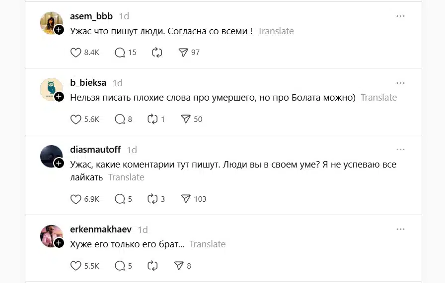 • «Масқара. Адамдардың жазбайтыны жоқ. Естен адастыңдар ма? Мен бәріне «like» қойып үлгермей жатырмын».