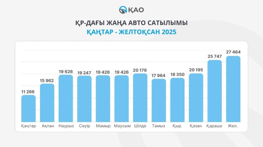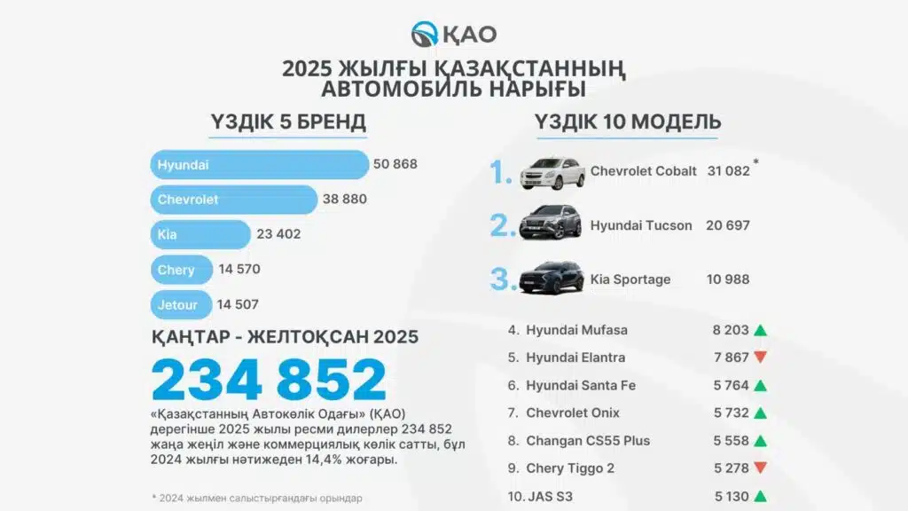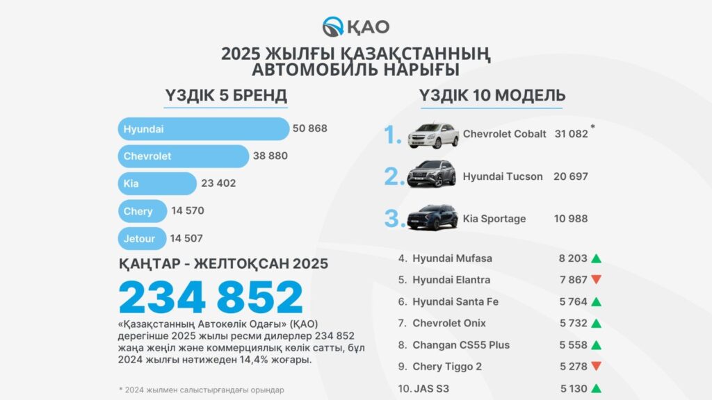 Қазақстанның автонарығы 2025 жылды тарихи рекордпен аяқтады. Елімізде жеңіл темір тұлпар сатылымы 14,4%-ға өсіп, 234,8 мың бірлікке жетті. Бұл тарихи рекордтық көрсеткіш. Қазақстан автокөлік одағының (ҚАО) мәліметінше, көшбасында әдеттегідей Chevrolet Cobalt шықты. Бұл модель елде ең көп сатылып, кореялық кроссоверлерді артта қалдырды.
