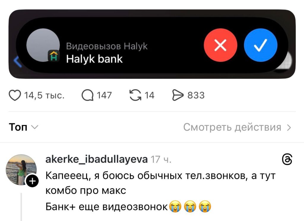 Тредс желісінде zhumabaeva___sa атты қолданушы өзіне Халық банк видеоқоңырау шалғанын скринмен түсіріп алып, фотосуретін жариялады. Оқиға желіде қызу талқыланып жатыр.