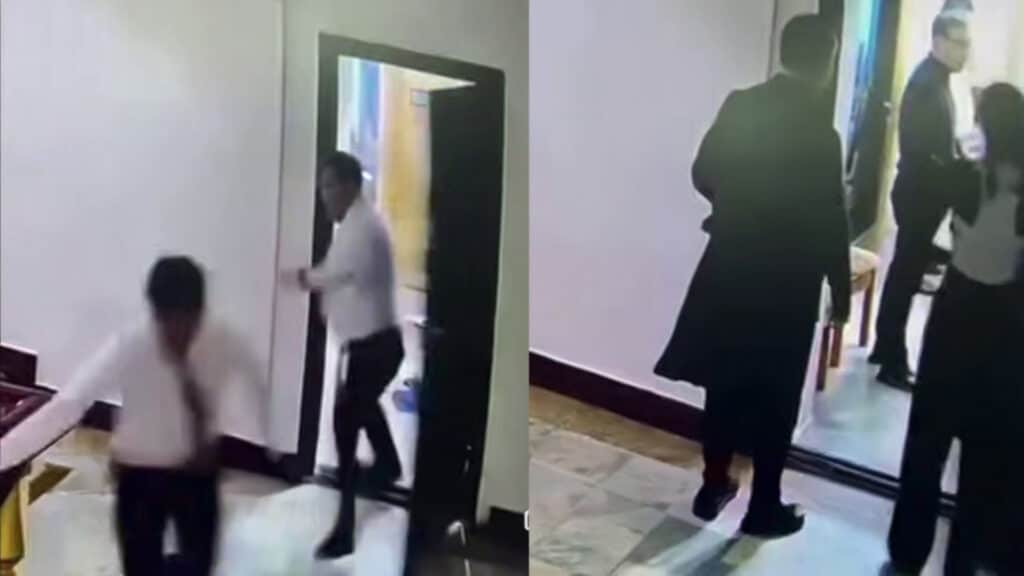 Видеода Серік Сәпиев орынбасары самбодан әлем чемпионы Есімхановпен жаға жыртысып, кабинеттен шыққаны көрініп тұр.