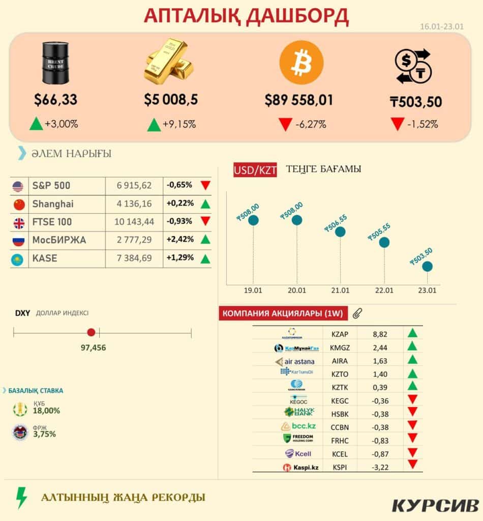 Осы аптада алтын құны психологиялық 5000 нүтесіне тест жасап көрді. Бір аптада 9 пайыздан астам өсім көрсетті. Нарықта қазір алтынға сұраныс анық сезіледі. Бұған басты себеп Таяу Шығыстағы геосаяси жағдайдың ушығуы және Гренландия төңірегіндегі даудың АҚШ пен оның одақтастары арасындағы қарым-қатынасты күрделендіруі. Осындай белгісіз кезеңдерде инвесторлар тәуекелі жоғары активтерден шығып, ақшаны «тыныш айлақтарға» бағыттайды. Соның ішіндегі ең сенімдісі – GOLD. Нәтижесінде бағалар бір апта ішінде 10%-дан астам өсіп кетті. Маңыздысы бұл өсім қысқа мерзімді алыпсатарлықтың емес, капиталдың қорғаныш активтерге жүйелі түрде ауысуының көрінісі.