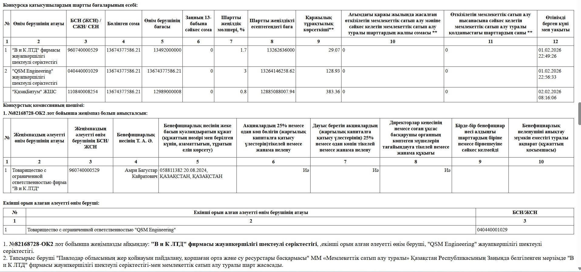 Қанат Момынов төрағалық еткен комиссия мүшелері «В и К ЛТД» компаниясын жеңімпаз деп таныды.