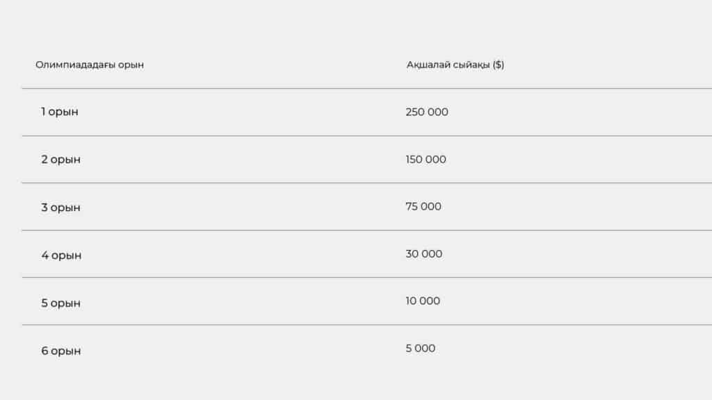 Дегенмен, Олимпиададағы жеңістерге берілетін сыйақы басқаларға қарағанда әлдеқайда көп болады.Мысалы, Азия ойындарындағы жеңіс 10 мың долларға бағаланса, бұл Олимпиададағы жеңістен 25 есе аз.