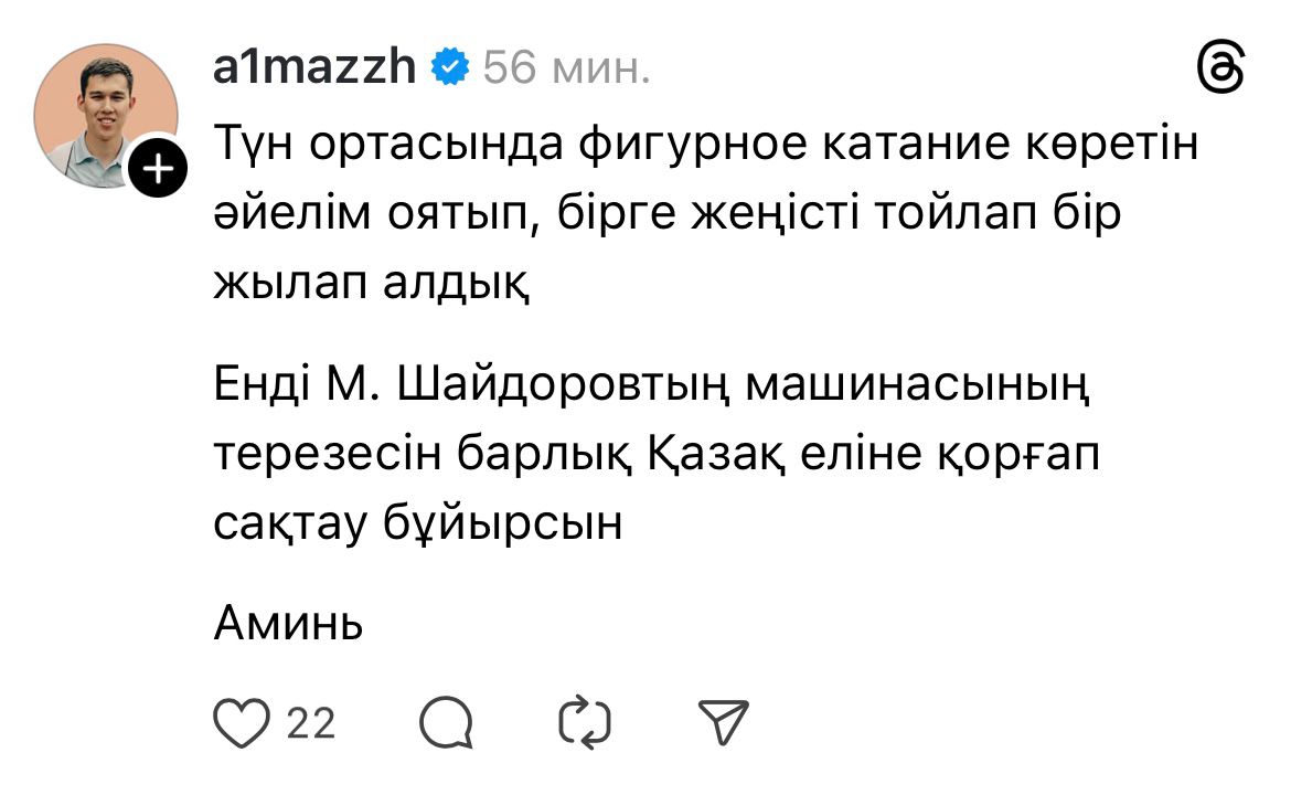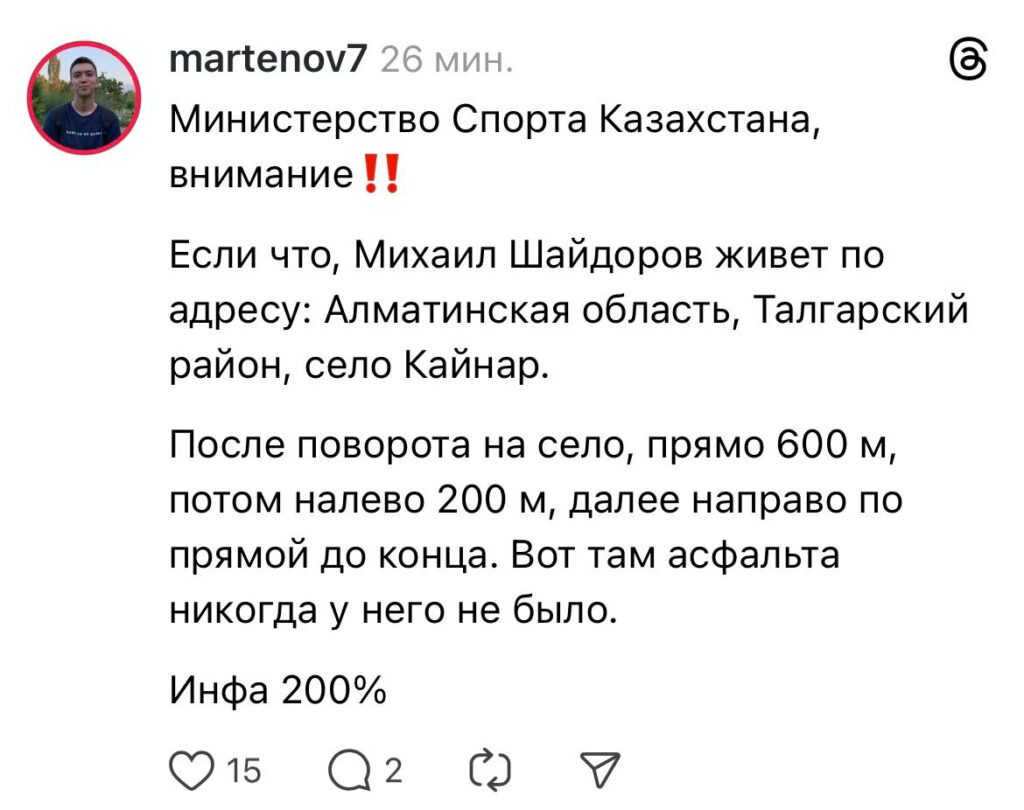 Бүгін қазақстандықтар Михаил Шайдоровтың жеңісін тойлап жатыр. Таңертеңнен бері әлеуметтік желі қолданушыларды желіні Шайдоровқа арнаған жазбалармен толтырды. Бірі Михаилды құттықтап Денис Тенді құттықтаса, бірі оның есігінің алдына «асфальт төсеуді» сұрайды.