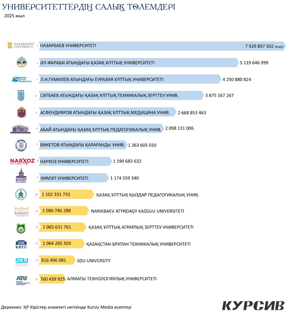 - M.S. Narikbaev атындағы KAZGUU (1,08 млрд): Заңгерлік білім берудегі жекеменшік сектордың көшбасшысы. Салық төлемі 2023 жылдан бері 46%-ға өскен.