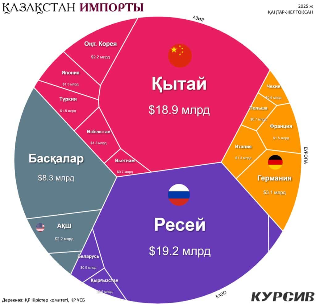 - Қытай: Импорт көлемі 18,9 млрд долларға жетіп, Қазақстан нарығындағы басты жеткізушіге айналды.