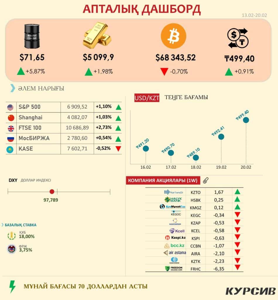 - USD/KZT: Теңге бағамы апта ішінде 0,91%-ға әлсіреп, 499,40 теңге деңгейіне тұрақтады. Бұл 500 теңгелік меже алдындағы үлкен сынақ.