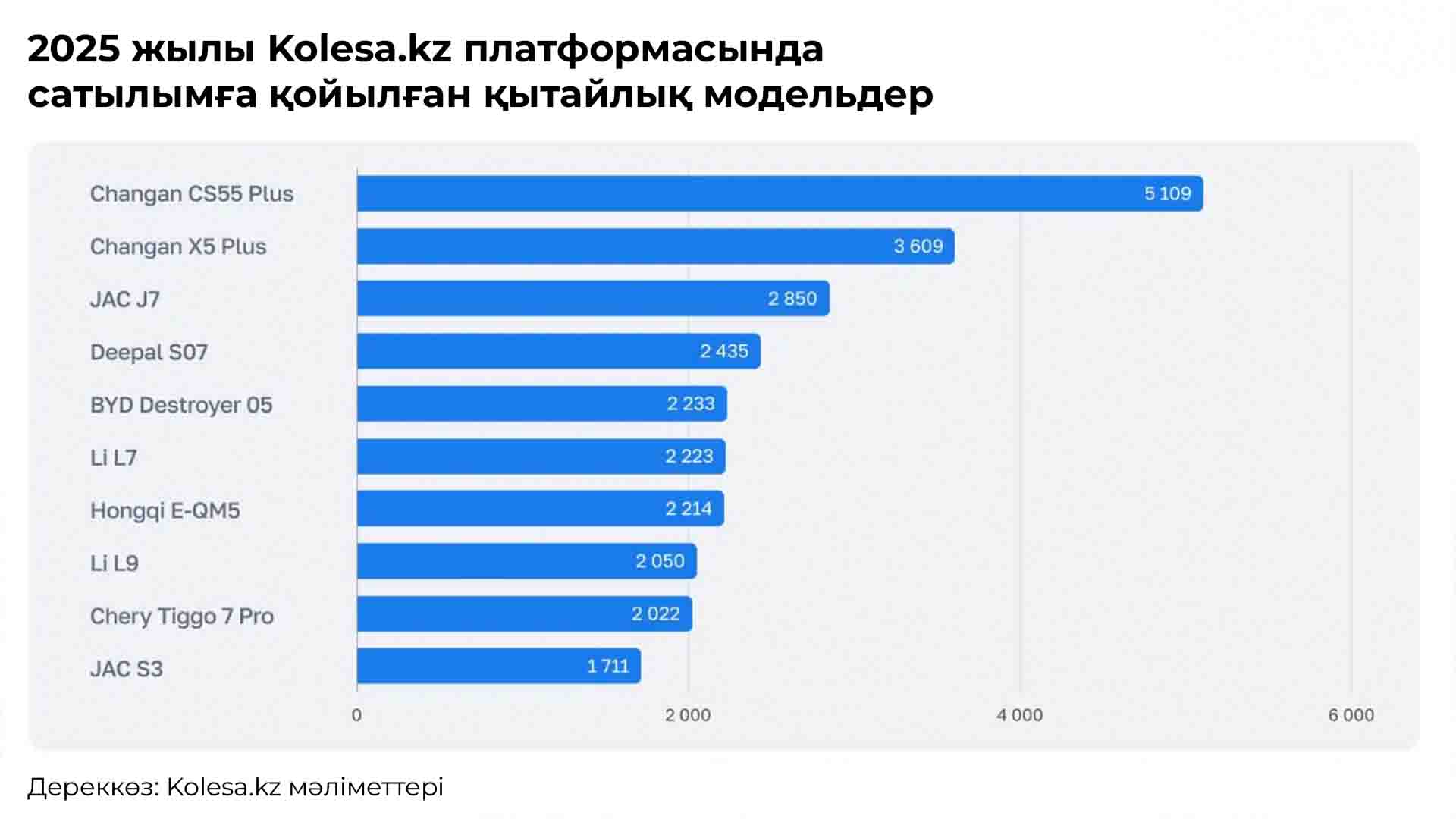 Kolesa.kz платформасында қолданыстағы қытай автокөліктерін сату туралы хабарландырулар саны шамамен үш есеге өсіп, жалпы көлемнің 3,7%-ына жетті. Көлік иелері сатылымға ең жиі мына модельдерді шығарады: