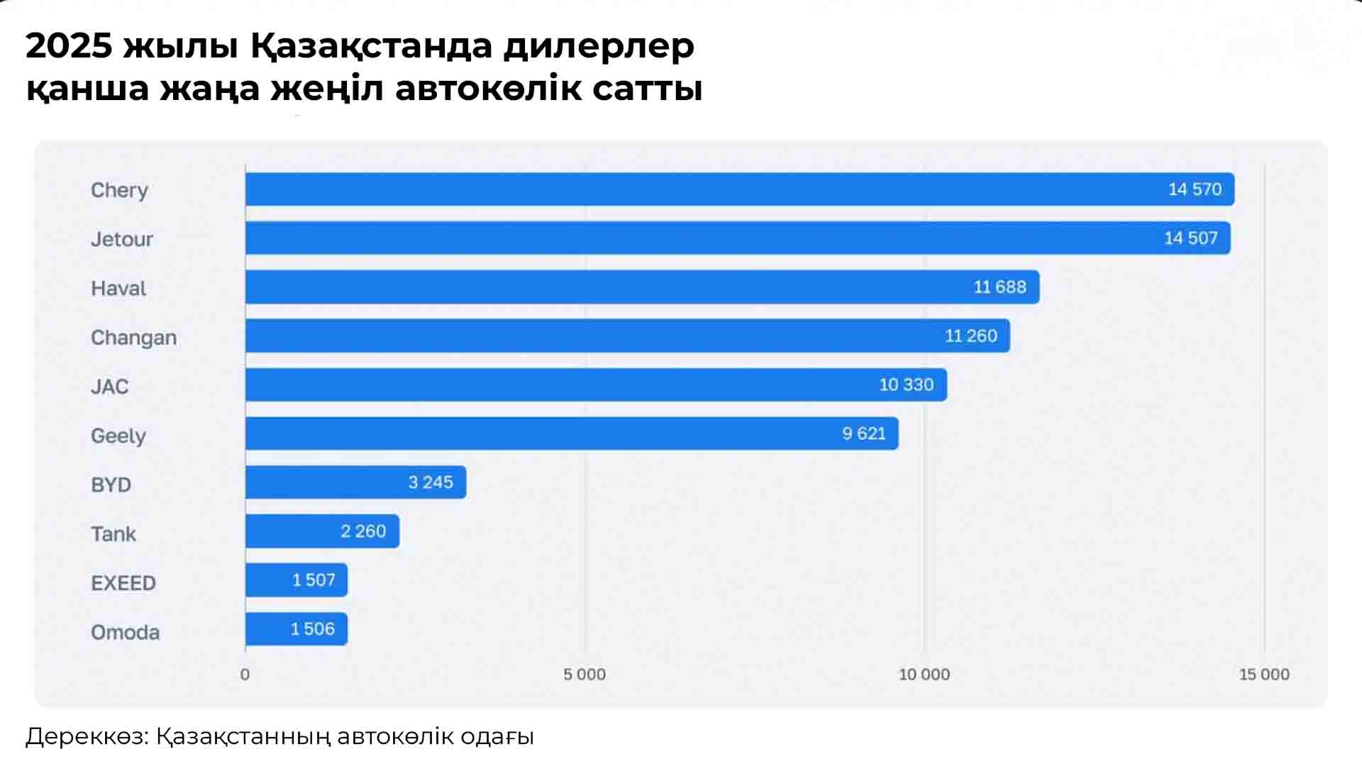Айта кетейік, көптеген қазақстандықтар Chery, Haval, Geely, Changan, Jetour сияқты брендтерді таңдайды. Қазақстанның автокөлік одағының дерегінше, олар елде ең көп сатылған көліктердің ондығына кіреді.