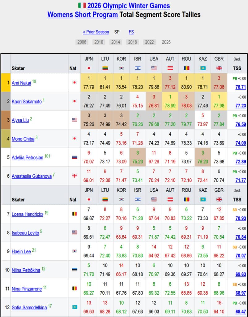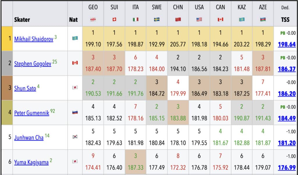 Осы кестеден байқағандай, Қазақстан төрешісі Шайдоровқа өзгелермен салыстырғанда жоғары баға қойғаны байқалады. Ал Самоделкинаға Парецкая 70 балл қойғанмен, өзге төрешілер одан да төмен балл ұсынған.