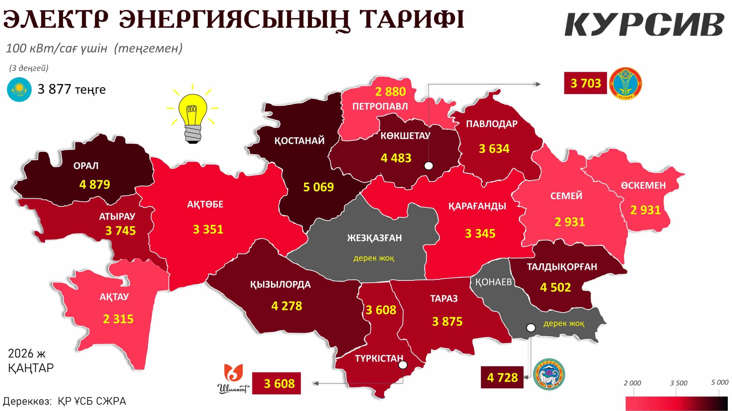 - Ең жоғары тарифтер: Жарық үшін ең көп төлейтін өңір – Қостанай қаласы. Мұнда 100 кВт/сағ құны 5 069 теңгеге жеткен. Одан кейінгі орындарда батыстағы Орал (4 879 теңге) және оңтүстік астанамыз Алматы (4 728 теңге) тұр. Сонымен қатар, Көкшетау (4 483 теңге) мен Қызылорда (4 278 теңге) тұрғындары да жарық үшін орташа республикалық деңгейден әлдеқайда көп төлейді.