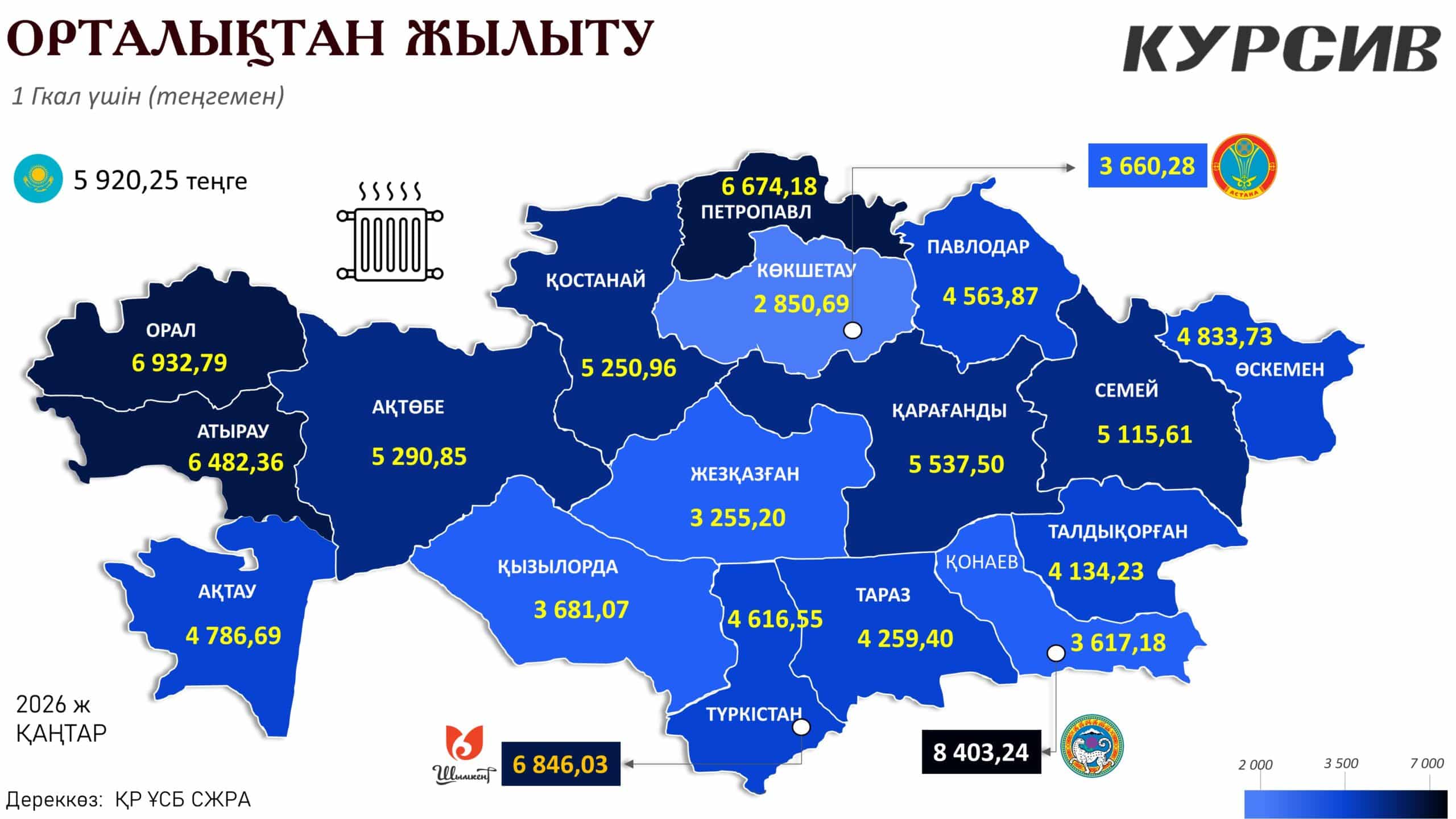 - Қымбат мегаполистер: Ең жоғары тариф, бір қызығы, оңтүстік мегаполисте тіркелген. Алматыда жылу құны рекордтық 8 403,24 теңгені құрайды. Бұл орташа республикалық бағадан әлдеқайда жоғары. Қымбатшылық бойынша екінші орында Орал (6 932,79 теңге), үшінші орында Шымкент қаласы (6 846,03 теңге) орналасқан. Солтүстіктегі Петропавл (6 674,18 теңге) мен Атырау (6 482,36 теңге) да қымбат қалалар қатарында.