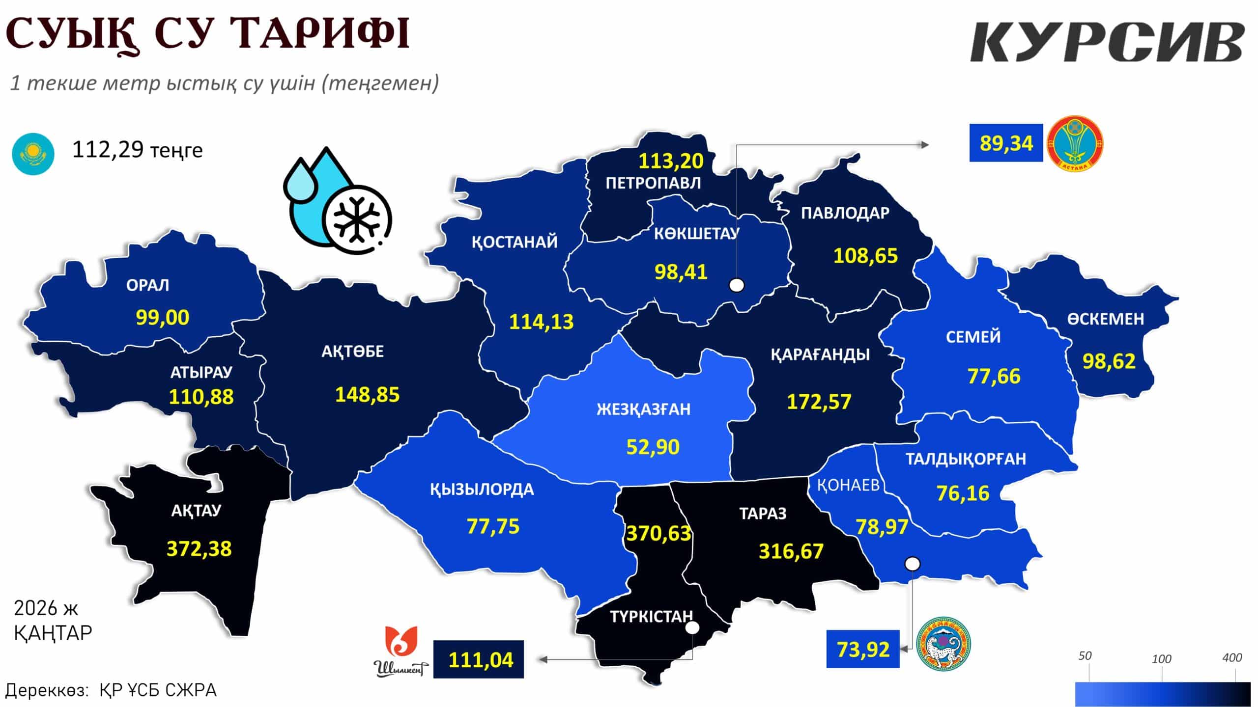 - Ең арзан су: Су ресурстарына бай немесе инфрақұрылымы оңтайландырылған қалаларда су бағасы әлдеқайда төмен. Мысалы, Жезқазғанда 1 текше метр су бар-жоғы 52,90 теңге тұрады. Алматы (73,92 теңге), Талдықорған (76,16 теңге), Семей (77,66 теңге) және Қызылорда (77,75 теңге) қалаларында да ауыз су өте арзан. Елордадағы баға 89,34 теңгені құрап, орташа республикалық деңгейден төмен болып отыр.