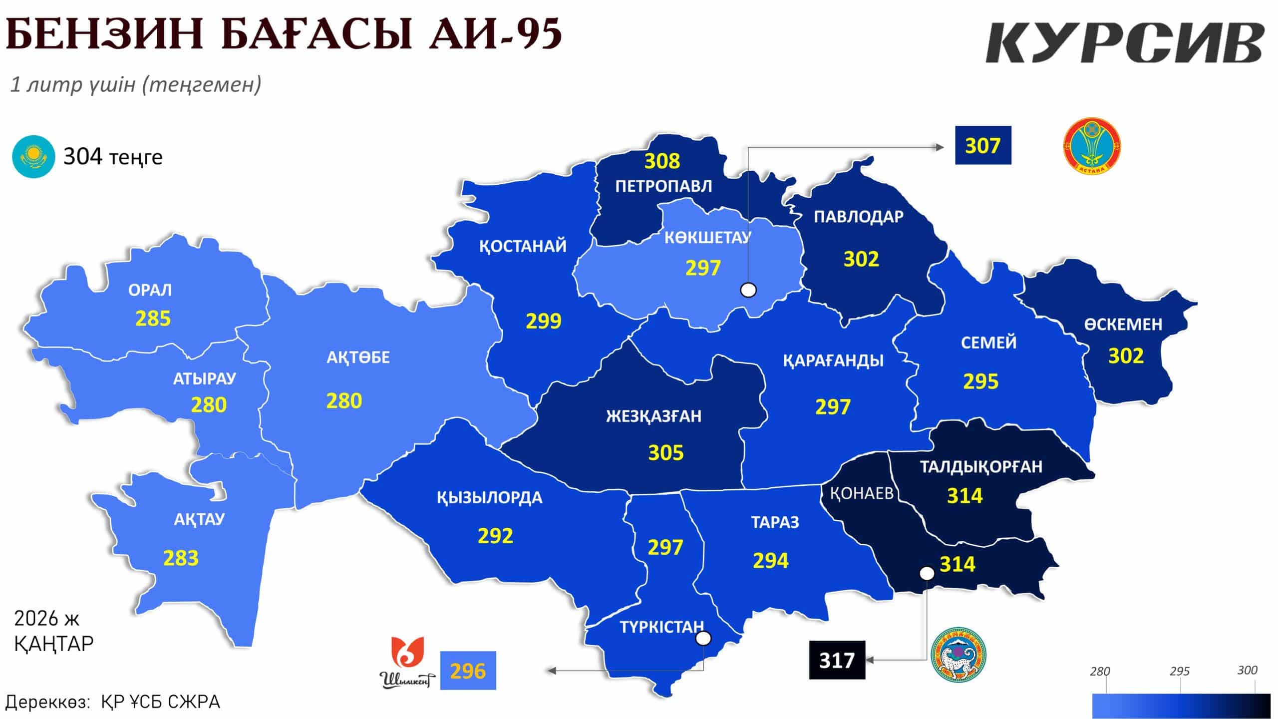 Инфографикаға сүйенсек, 2026 жылдың басында АИ-95 маркалы бензинінің ең жоғары бағасы Алматы қаласында (317 теңге) және Талдықорған мен Қонаев (314 теңге) аймақтарында тіркелген. Ал ең қолжетімді баға батыс өңірлерде: Атырау мен Ақтөбеде – 280 теңге.