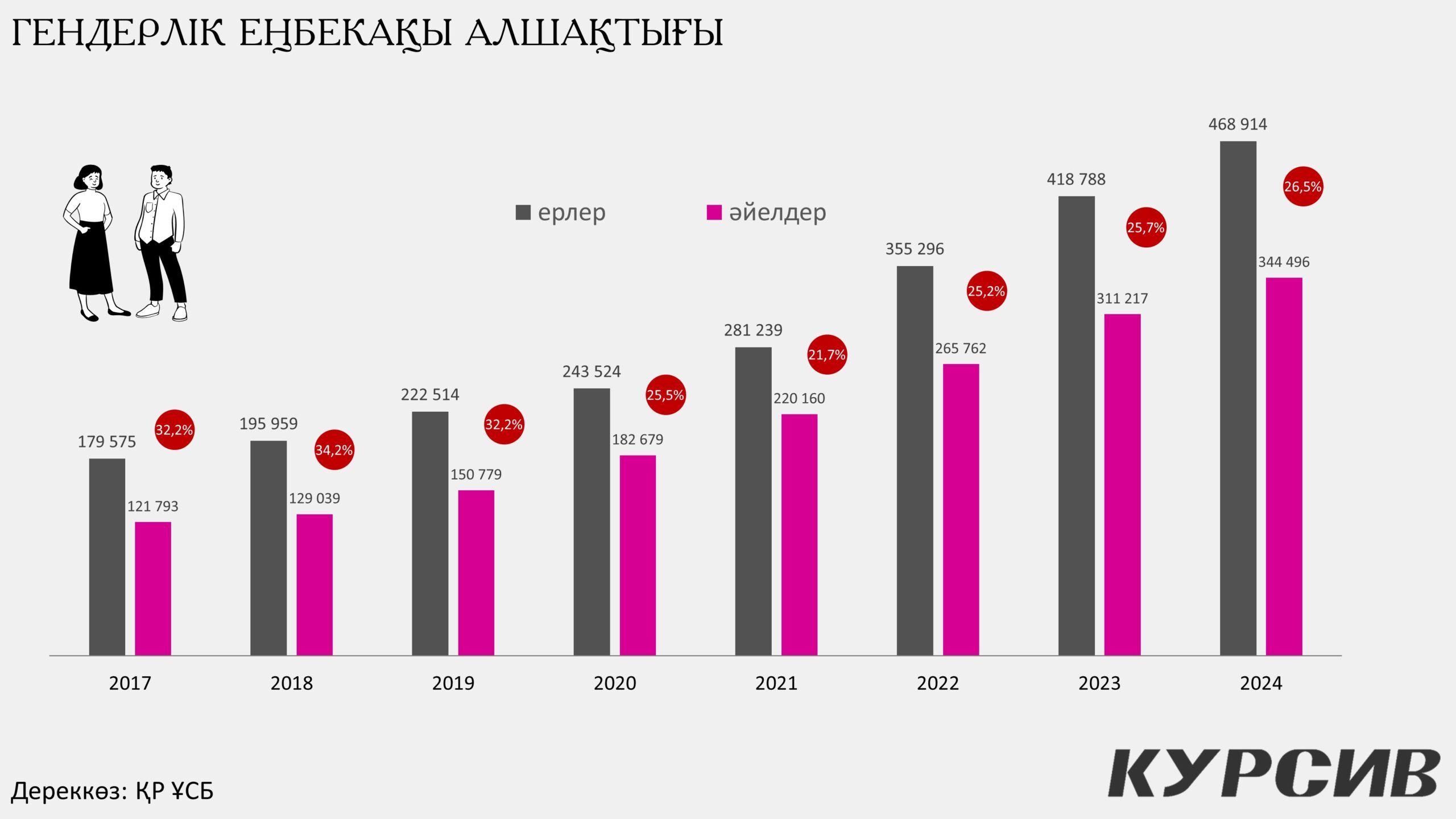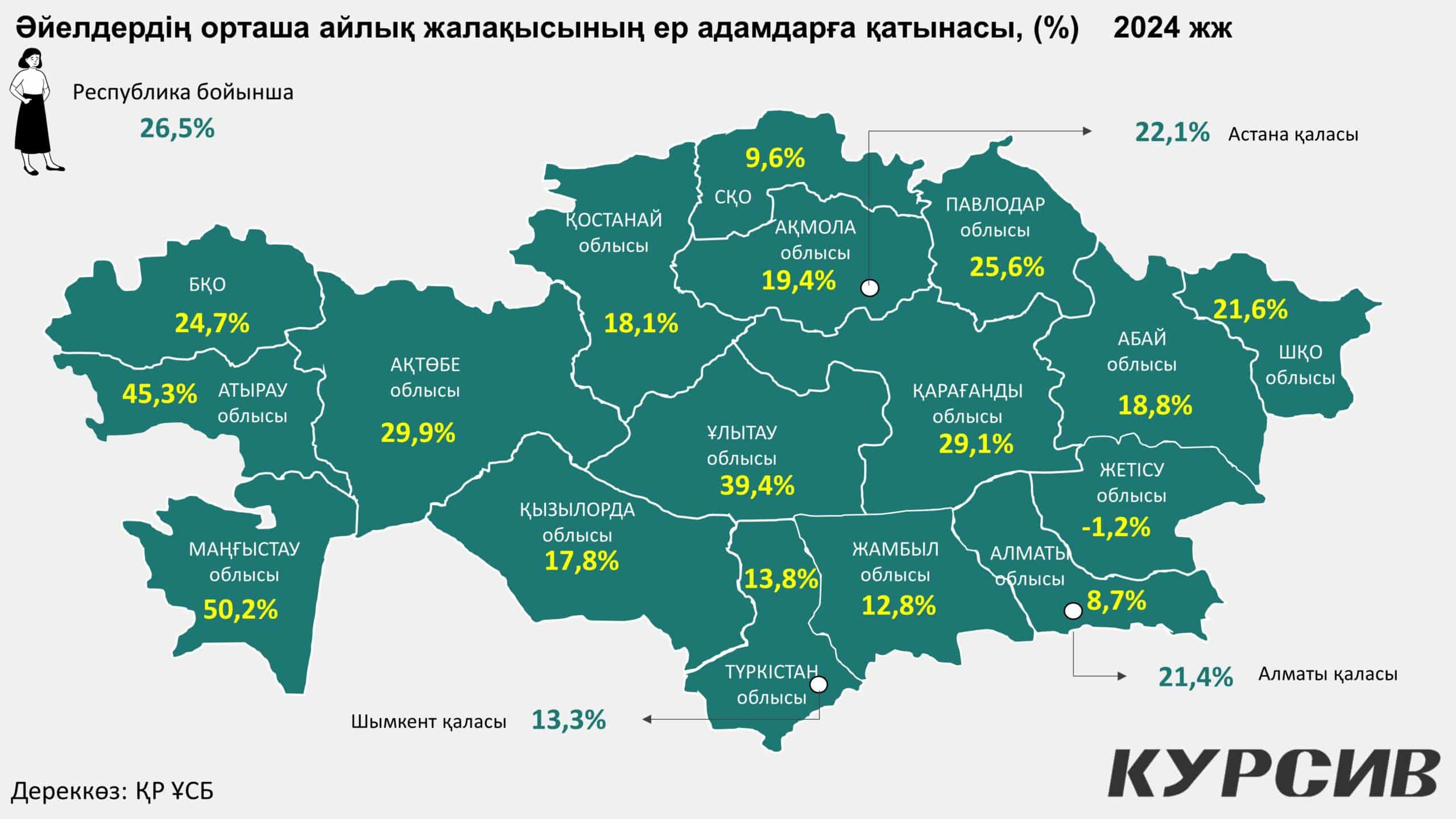 Kursiv.Media зерттеуінше, соңғы жылдары Қазақстанда жалақы деңгейінің өсуі байқалғанымен, ерлер мен әйелдердің табысы арасындағы айтарлықтай теңсіздік әлі де сақталып отыр. ҚР ҰСБ таратқан 2024 жылғы мәліметтерге сәйкес, республика бойынша гендерлік алшақтық 26,5%-ды құрады. Бұл дегеніміз – ер адам 100 теңге тапқан жерде, әйел адамның еңбегі орташа есеппен небәрі 73,5 теңгеге бағаланады деген сөз.