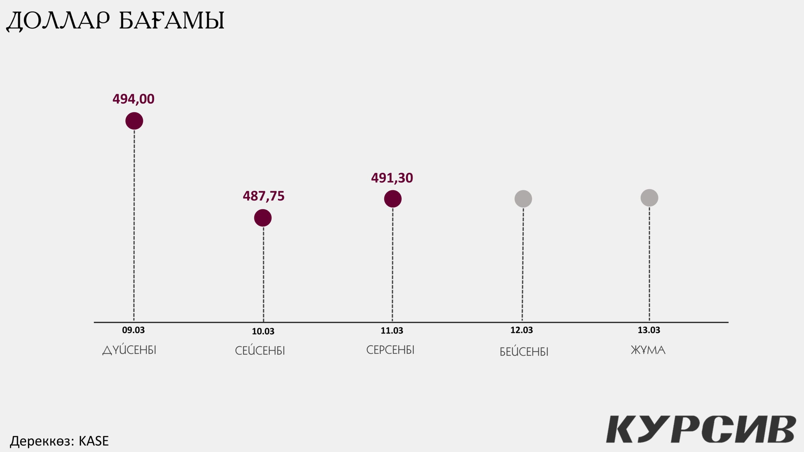 KASE деректеріне сәйкес, осы аптада теңге бағамы айтарлықтай құбылмалылық көрсетіп отыр. Апта басында доллар 494,00 теңгеге дейін көтерілгенімен, сейсенбіде күрт төмендеп, 487,75 теңге деңгейінде бекітілді. Алайда, бүгін (сәрсенбіде) сауда-саттық қорытындысы бойынша ұлттық валюта қайтадан әлсіреп, бағам 491,30 теңгеге дейін көтерілді.
