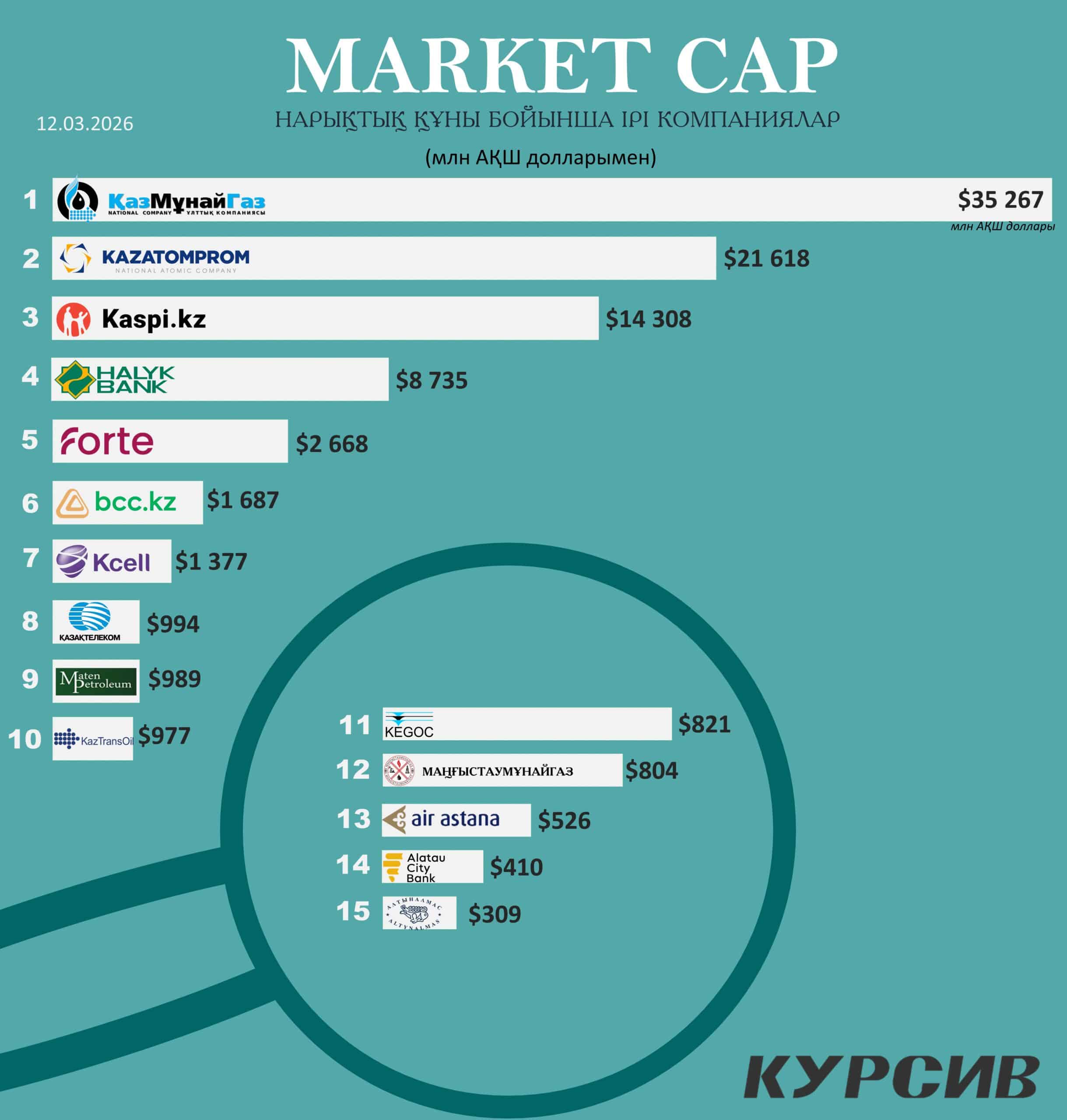 Қазақстанның қор нарығындағы (KASE) компаниялардың капиталдану деңгейі ел экономикасының драйверлерін айқын көрсетеді. Kursiv Media 2026 жылғы наурыздағы мәліметтер бойынша еліміздегі ең қымбат компаниялардың тізімін анықтады. Нарықтық құны бойынша жалпы тізімде мұнай-газ, уран және қаржы секторлары көш бастап тұр.