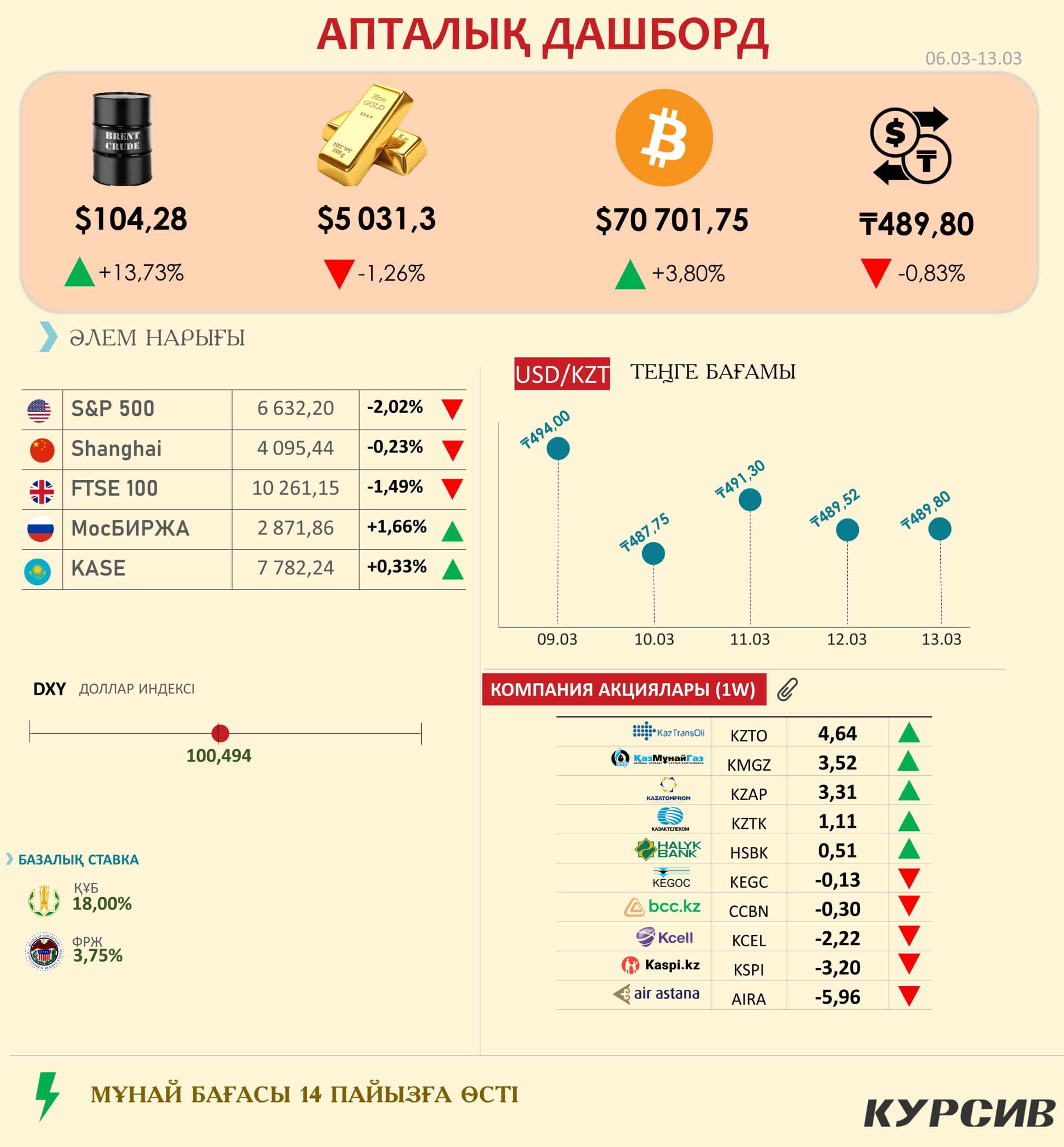 - Валюта (USD/KZT): Теңге апта басындағы $494,00 көрсеткішінен нығайып, апта соңында 489,80 теңгеге дейін төмендеді (-0,83%). Мұнай бағасының өсуі теңгенің жаһандық қысымға төтеп беруіне көмектесуде.