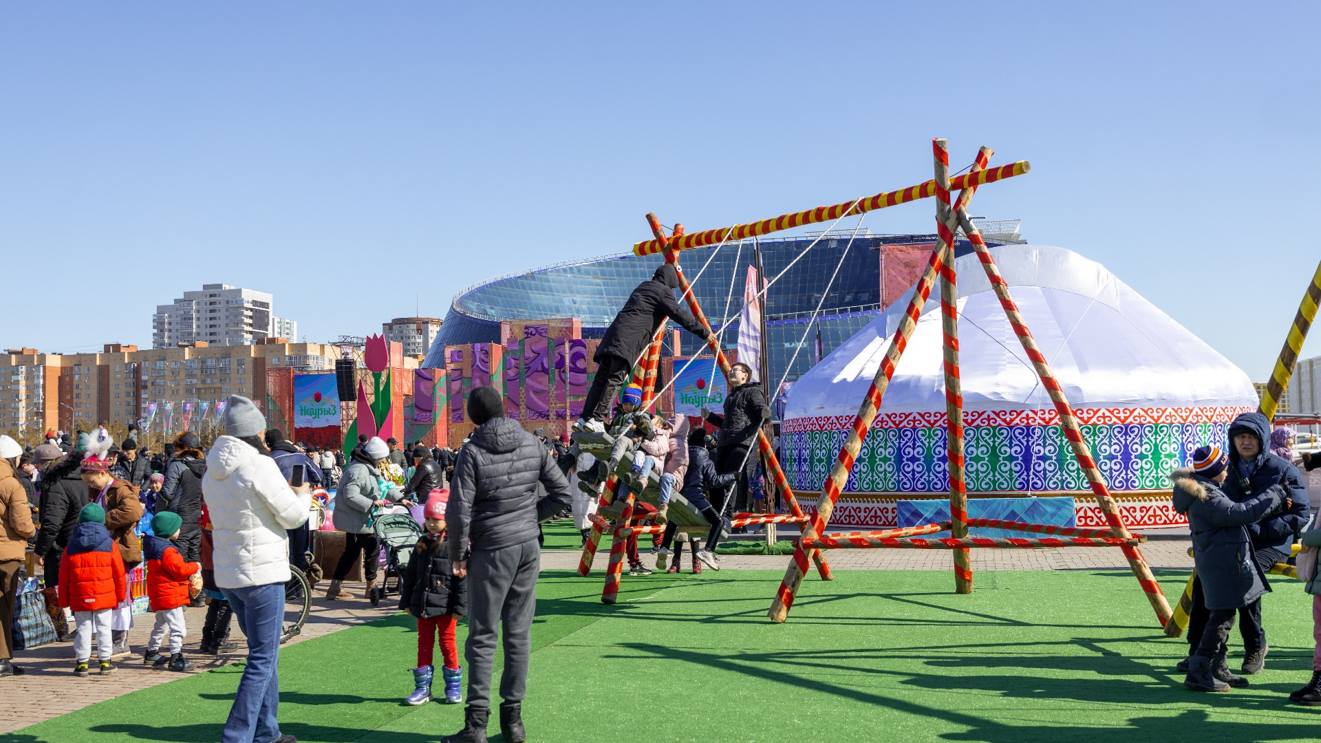 Техникалық талаптарға сәйкес, алаңда диаметрі 6 метрлік 6 дәстүрлі киіз үйден тұратын этномәдени кешен бой көтереді. Әрбір киіз үйдің іші сандық, текемет, сырмақ сияқты жәдігерлер және қолөнер бұйымдарымен безендіріледі. Сонымен қатар, мерекелік аймаққа кіреберісте биіктігі 6 метрлік екі салтанатты арка мен биіктігі 5 метр болатын «Бір шаңырақ астында» атты бірегей арт-инсталляция орнатылады. Бұл композиция алтын шаңырақты ұстап тұрған төрт мүсіндік қолдан тұрып, халық бірлігін бейнелейді.