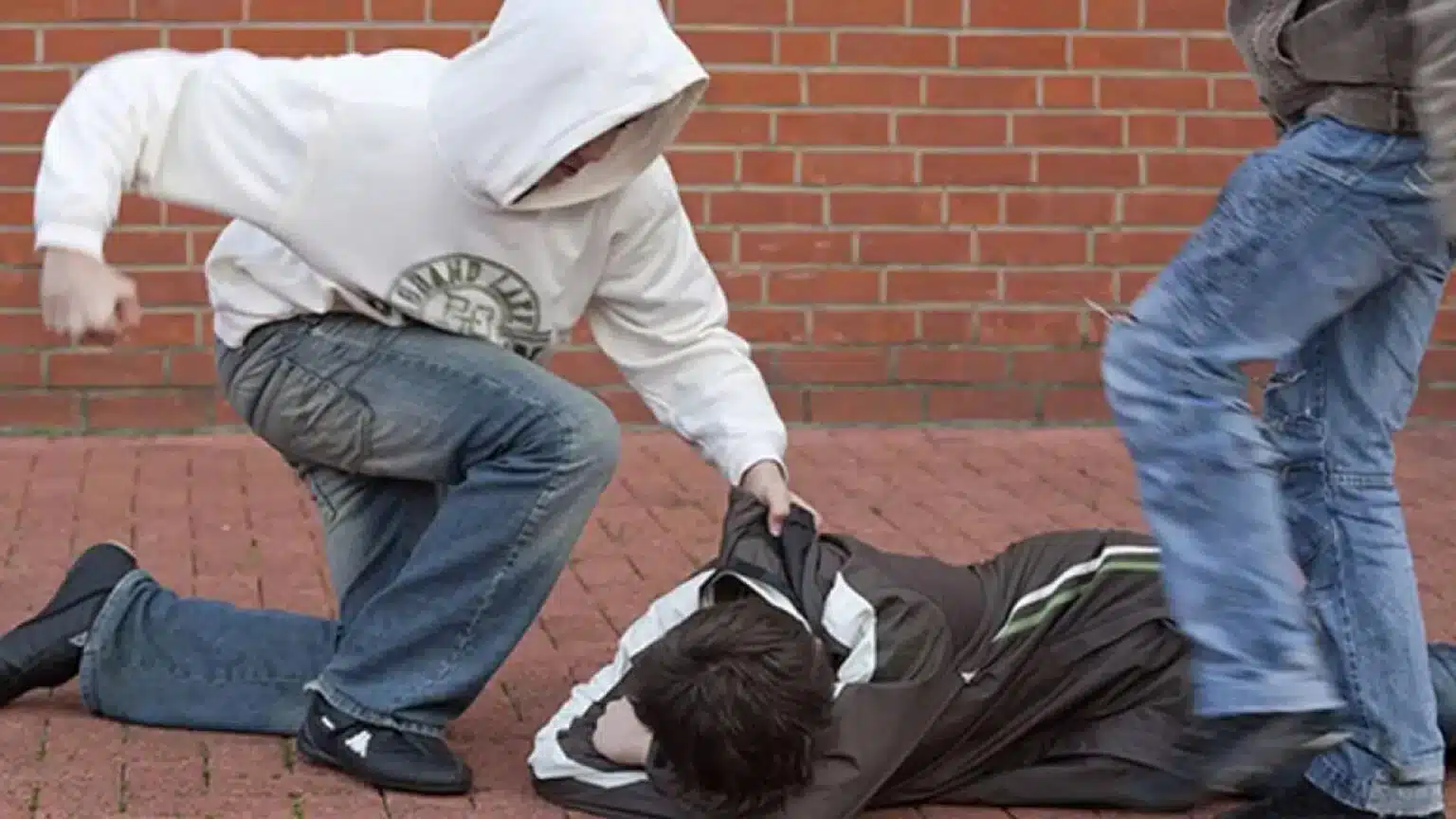 Бейнежазбада екі ер адамның жерде жатқан үшінші адамды басынан теуіп жатқанын көруге болады.