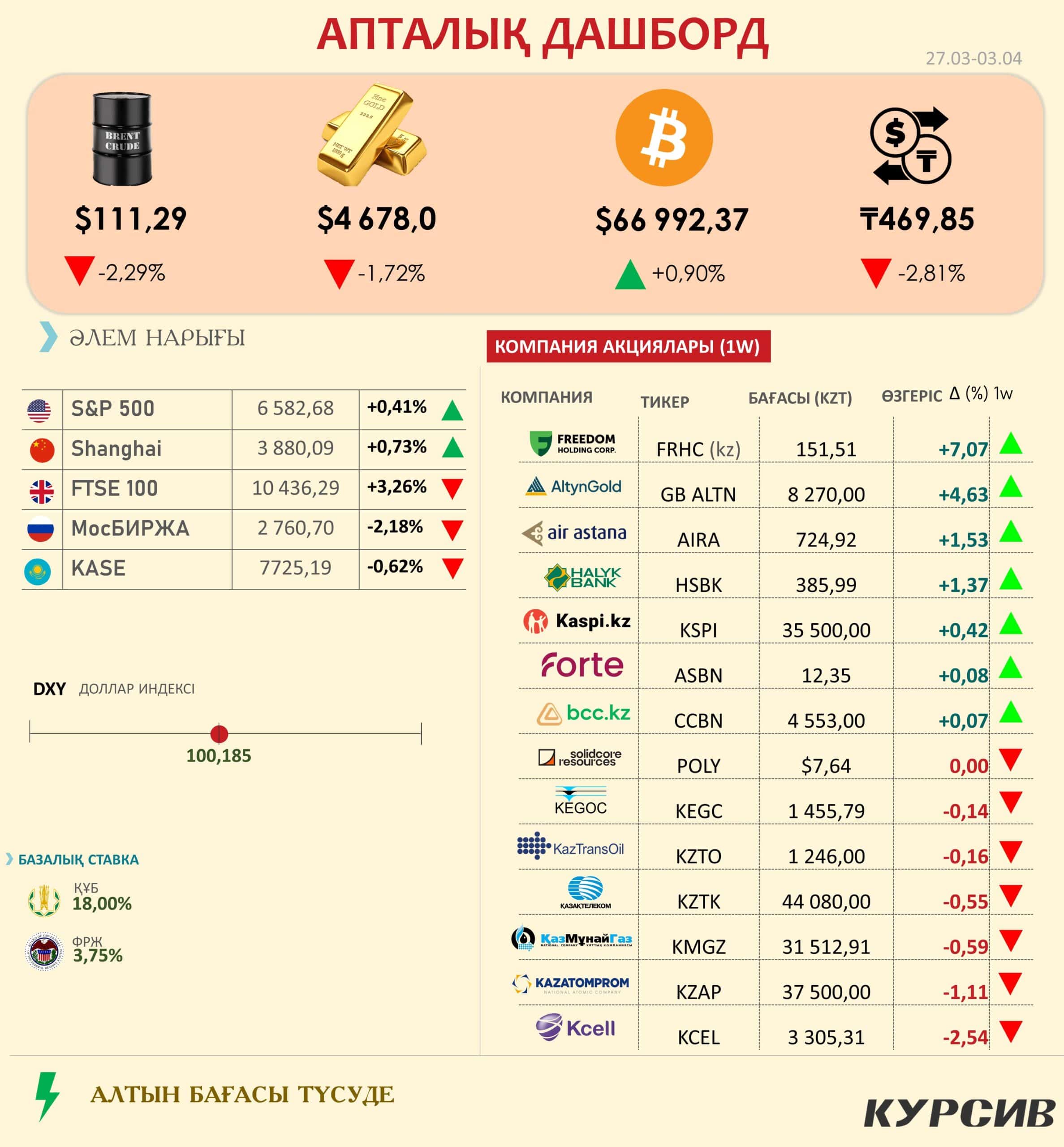 - Brent мұнайы: Бір баррель үшін $111,29 деңгейінде тұрақтап, апта ішінде 2,29%-ға арзандады. Таяу Шығыстағы және тұтастай аймақтағы соңғы әскери іс-қимылдар аясында әлемдік мұнай бағасы құбылмалылық танытуда. Әсіресе, Таяу Шығыстағы, атап айтқанда Сауд Арабиясы, Ирак және аймақтағы өзге де ірі өндіруші елдердегі жеткізілімдердің іркілуіне байланысты Brent маркалы мұнай бағасы айтарлықтай қысымға ұшырады. Мұндай құбылмалылық WTI мен Brent маркалары арасындағы баға алшақтығын ұлғайтты, бұл геосаяси тәуекелдердің өскенін айғақтайды.