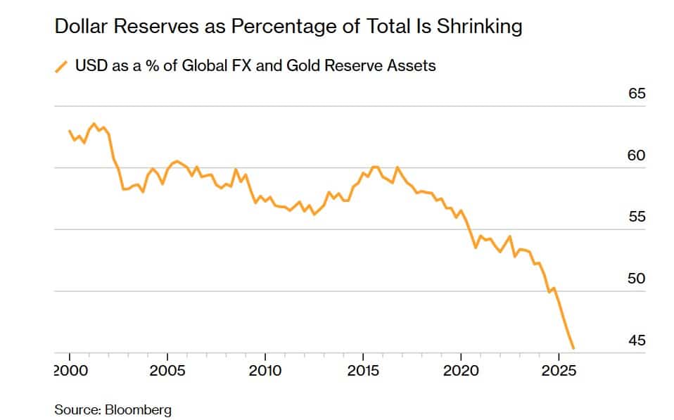 Bloomberg басылымының мәліметінше, АҚШ долларының әлемдік қаржы қорындағы беделі түсіп, соңғы 26 жылдағы ең төменгі деңгейге жетті. Қазір әлемдік валюта мен алтын қорының небәрі 46 пайызы долларға тиесілі. Мұның басты себебі – әлем елдерінің Орталық банктері долларға қарағанда алтынды көбірек жинауға көшкен. Дональд Трамп АҚШ президенті қызметіне келгелі бері доллар Орталық банктерді толық сендіретіндей тұрақтылық көрсете алмай отыр.