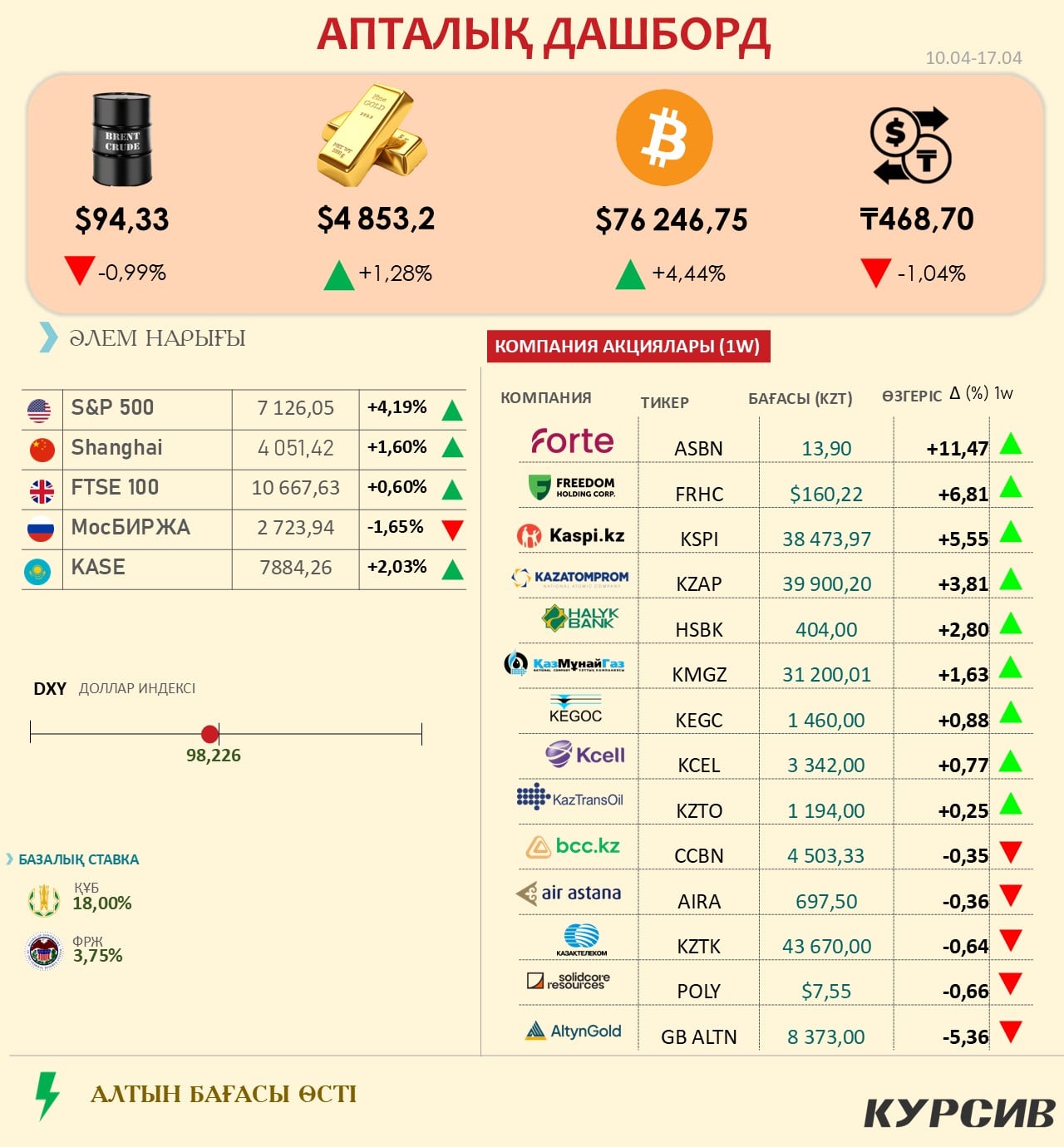 Теңге нығайып келеді (468,70 ₸). Доллар индексінің (DXY: 98,22) төмендеуі және ҚР Ұлттық Банкінің базалық ставканы 18% деңгейінде жоғары ұстауы теңгенің тартымдылығын арттырып тұр.