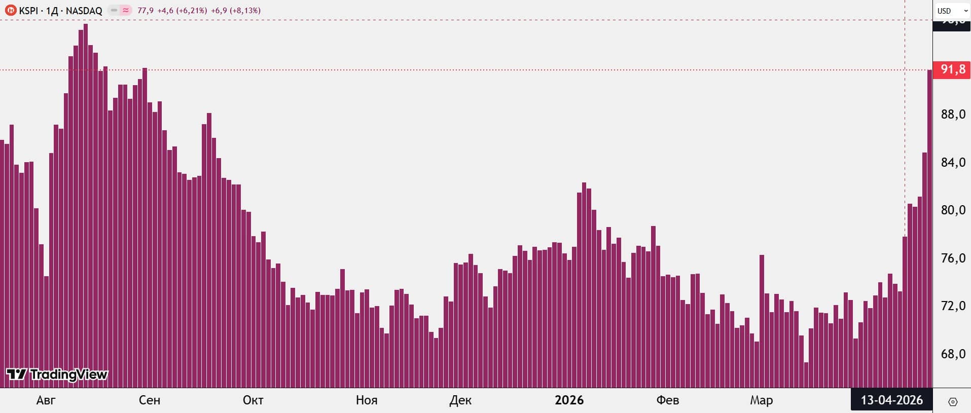NASDAQ қор биржасында 20 сәуірдегі сауда қорытындысы бойынша Kaspi.kz акциясы айтарлықтай өсті. Күндізгі сессияда (KSPI) акцияларының максималды бағасы 97,33 долларға дейін көтерілді. Ал сауда қорытындысы бойынша бір дана акция үшін соңғы баға 91,8 долларға дейін қымбаттап, өткен сессиядағы бағамен салыстырғанда 8,19 пайызға өсті.