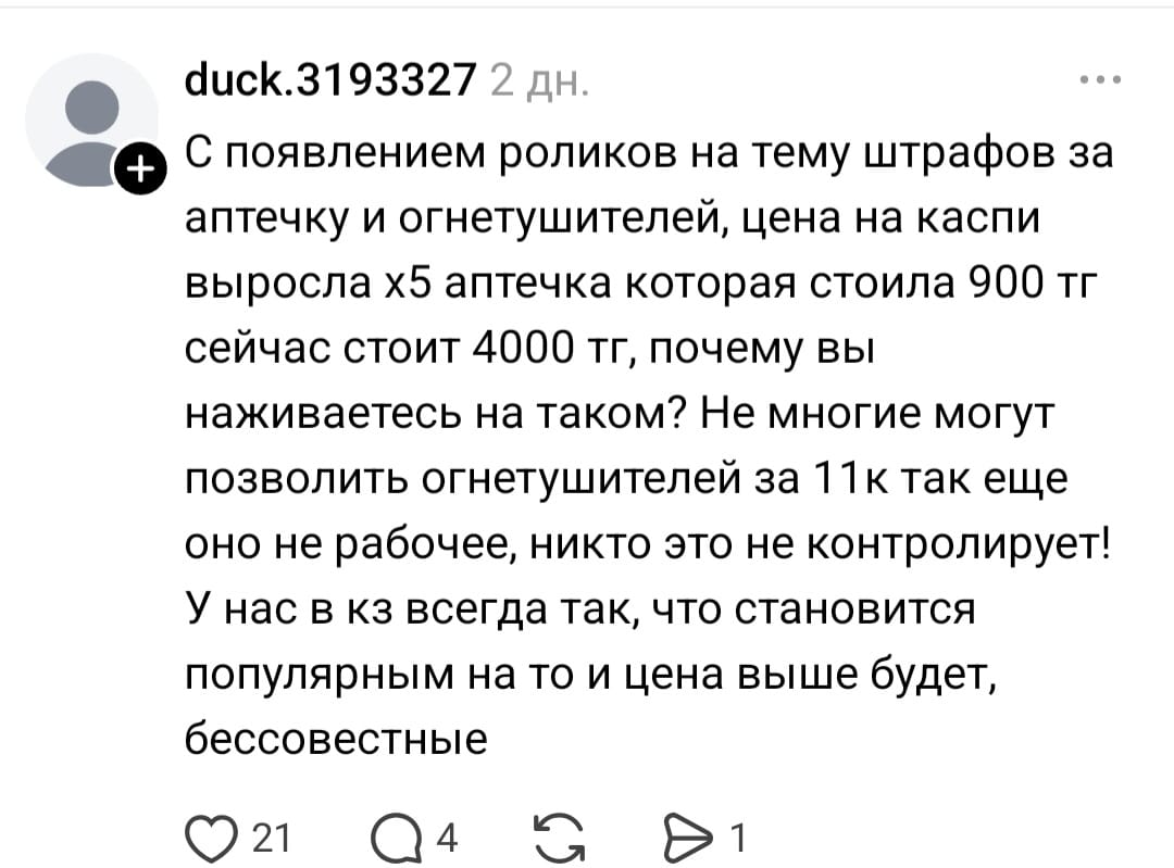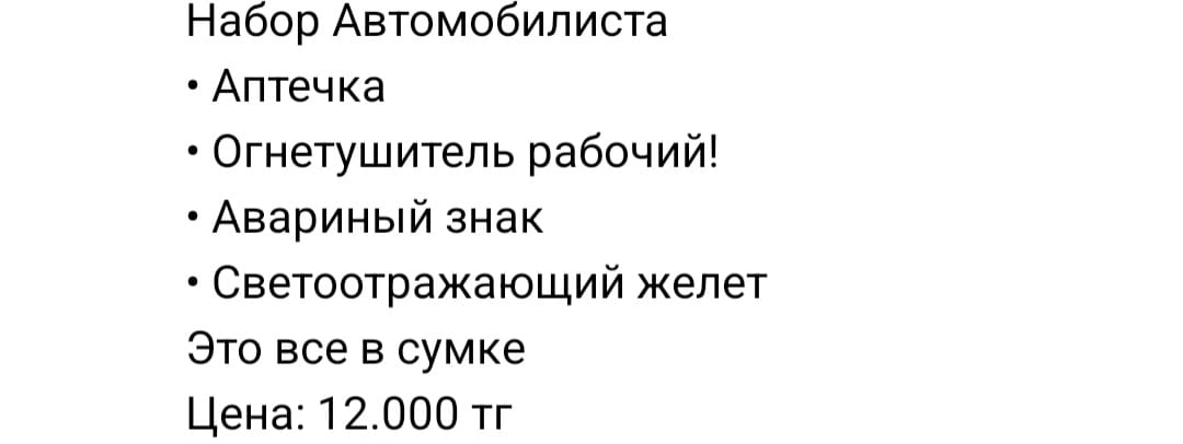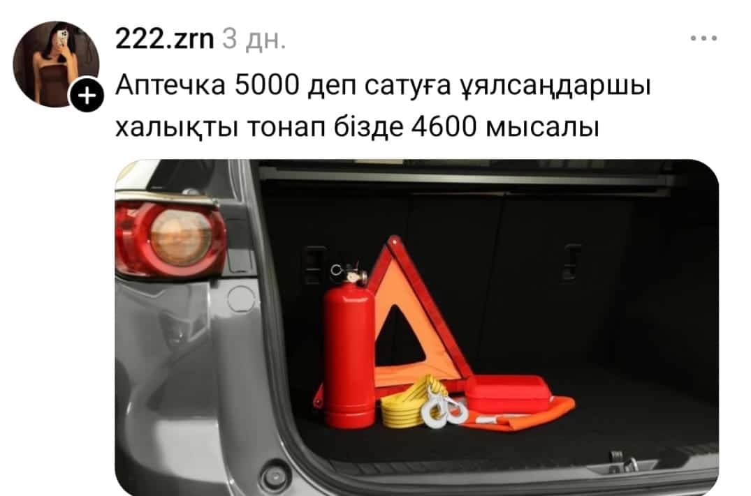 Соңғы күндері елде жол қауіпсіздігіне қатысты рейдтік шаралар күшейді. Полиция тексерісінен кейін кәсіпкерлер дәрі қобдишасы, апаттық белгі, қауіпсіздік жилеті мен өрт сөндіргіш секілді қарапайым заттардың бағасын өсіріп жіберген. Әлеуметтік желілерде автокөлікте болуға тиіс міндетті құрал-жабдықтардың бағасы қызу талқыланып жатыр. Курсив Авто олардың қаншадан саудаланып жатқанына шолу жасап көрді.