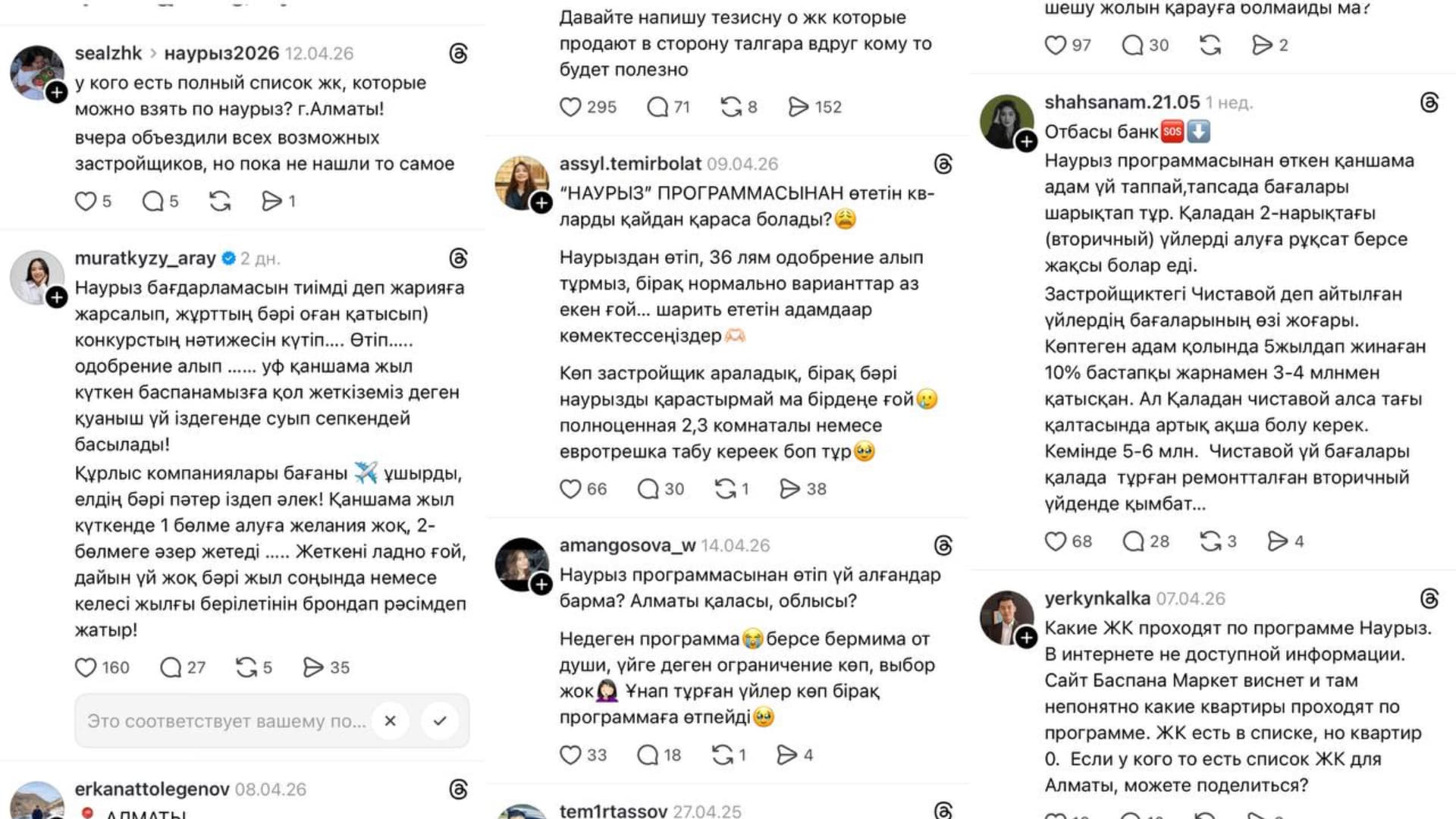 Threads желісінде Отбасы банктен жолдама алу баспаналы болу жолындағы істің басы ғана екенін, нағыз қиындық үй іздеуде басталатынын жазып жатқандар аз емес. Бәрінің дерлік шағымы ұқсас. Алғашқы нарықта бағдарлама аясында мақұлданған сомаға келетін пәтер жоқ, құрылыс компаниялары бағаны өсіріп жіберген. Пәтер болса да бір бөлме немесе қонақжайы асүймен жалғанған евростандарттағы екі бөлме. Пәтер дайын күйінде берілмейтінін ескерсек, жөндеу құны тағы бар. Ал көбі таза әрлеудегі үй алғысы келеді, ал ондай ұсыныс нарықта жоқтың қасы.