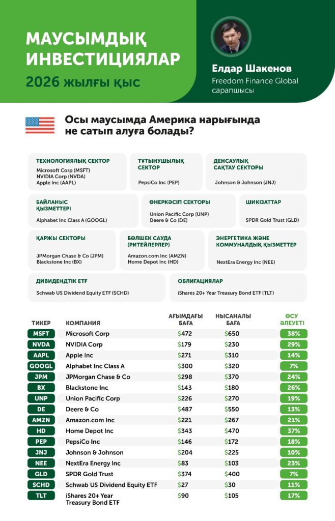 Қаржы нарығындағы қысқы кезең – компаниялар жылды аяқтап, есептілікті жариялайтын, ал инвесторлар жаңа деректер негізінде бағалауды жаңартатын уақыт. Осы сәтте ақша ағыны орнықты, дивидендтік әлеуеті және болжамды серпіні бар бизнеске назар аударылады. Сонымен бірге, қысқы уақытта тұтыну мен қуат көздері шығынының өсуіне сезімтал секторларға деген қызығушылық артады. Бұл шолуда Freedom Broker-дің талдаушылары инвестициялық идеялардың таңдауын ұсынады, олар 2026 жылғы қысқы маусымда теңдестірілген портфелді құруға жарайды.