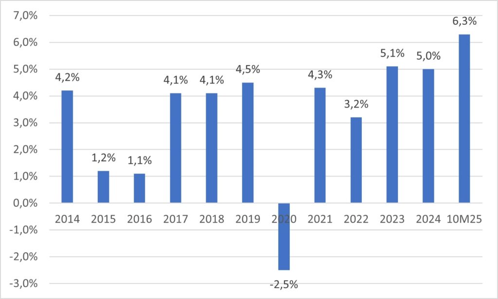 Қазақстанның ІЖӨ-сі өткен жылдары кестеде көрсетілгендей, жылына шамамен 3%-ға өсті. Ал 2023 жылы нақты өсім 5,1%-ды, 2024 жылы – 5%-ды құрады, ал 2025 жылғы 10 айда 6,4%-ға жетті. Бұл көрсеткіштен 2025 жыл ел экономикасы үшін ерекше жыл болғанын көріп отырмыз. Соңғы рет экономиканың өсу қарқыны 2011 жылы өте жоғары болды, ол кезде мұнай бағасының бір бөшке үшін 120 АҚШ долларына дейін қалпына келуі жағдайында 7,5%-ға жетті. Енді мұнай 65 АҚШ доллары ғана тұрады, бірақ экономика айтарлықтай өсті, бұл бірқатар фактормен түсіндіріледі.