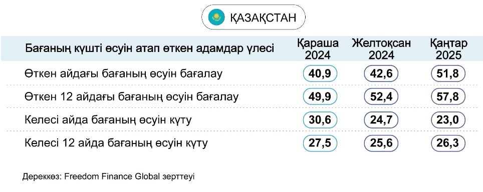 Freedom Finance Global Қазақстан тұрғындарының тұтынушы сенімділігін, инфляция және девальвация бойынша күтулерін зерттегеніне екі жыл үш ай болды. Зерттеу 2025 жылғы қаңтарда тұтынушылық сенімділіктің айтарлықтай төмендегенін және 93,2 пункт деңгейіне түскенін көрсетті. Бұл – зерттеу жүргізілген уақыттан бергі екінші ең төмен көрсеткіш. Жағымсыз жауаптар оң жауаптардан басым бола бастады. Оптимизмнің төмендеуі барлық аспекті бойынша орын алуда, әсіресе, экономикалық жағдайды бағалауда құлдырау байқалады. Көкөніс пен жеміс-жидек бағасының өскеннен, инфляциялық бағалау бір айда өсті. Екінші жағынан, инфляциялық күтулер бұрынғы деңгейде қалды, ал девальвациялық күтулер теңгенің қаңтар айының ортасынан бастап нығаюынан төмендеді.