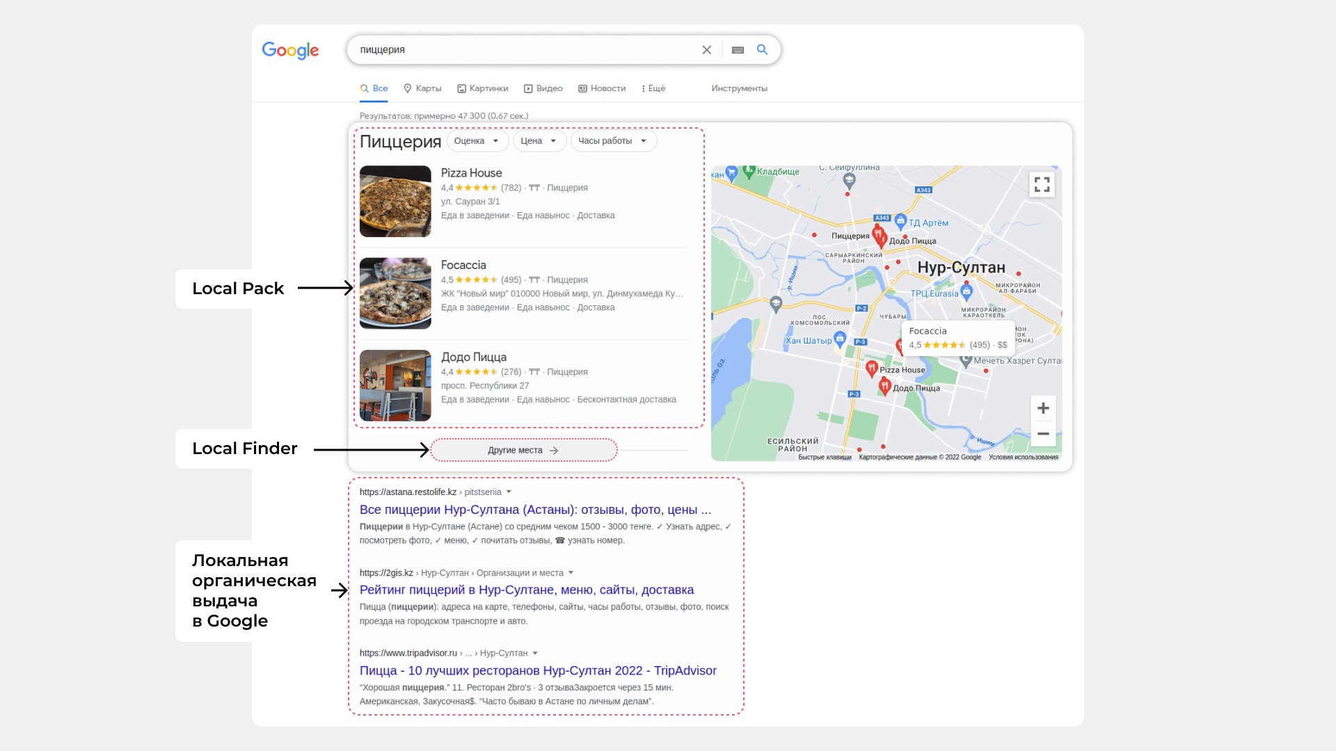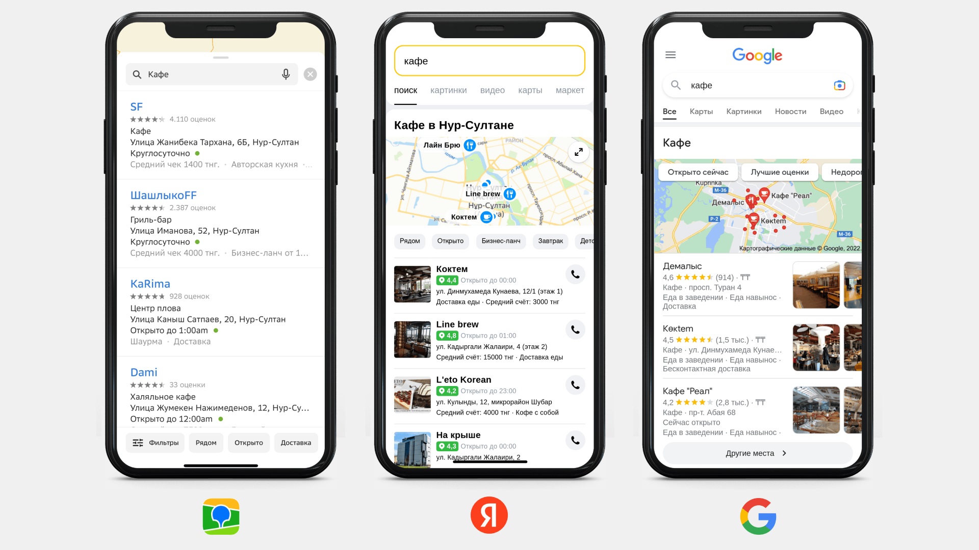 Так выглядит локальный поиск в Нур-Султане по запросу «кафе»
