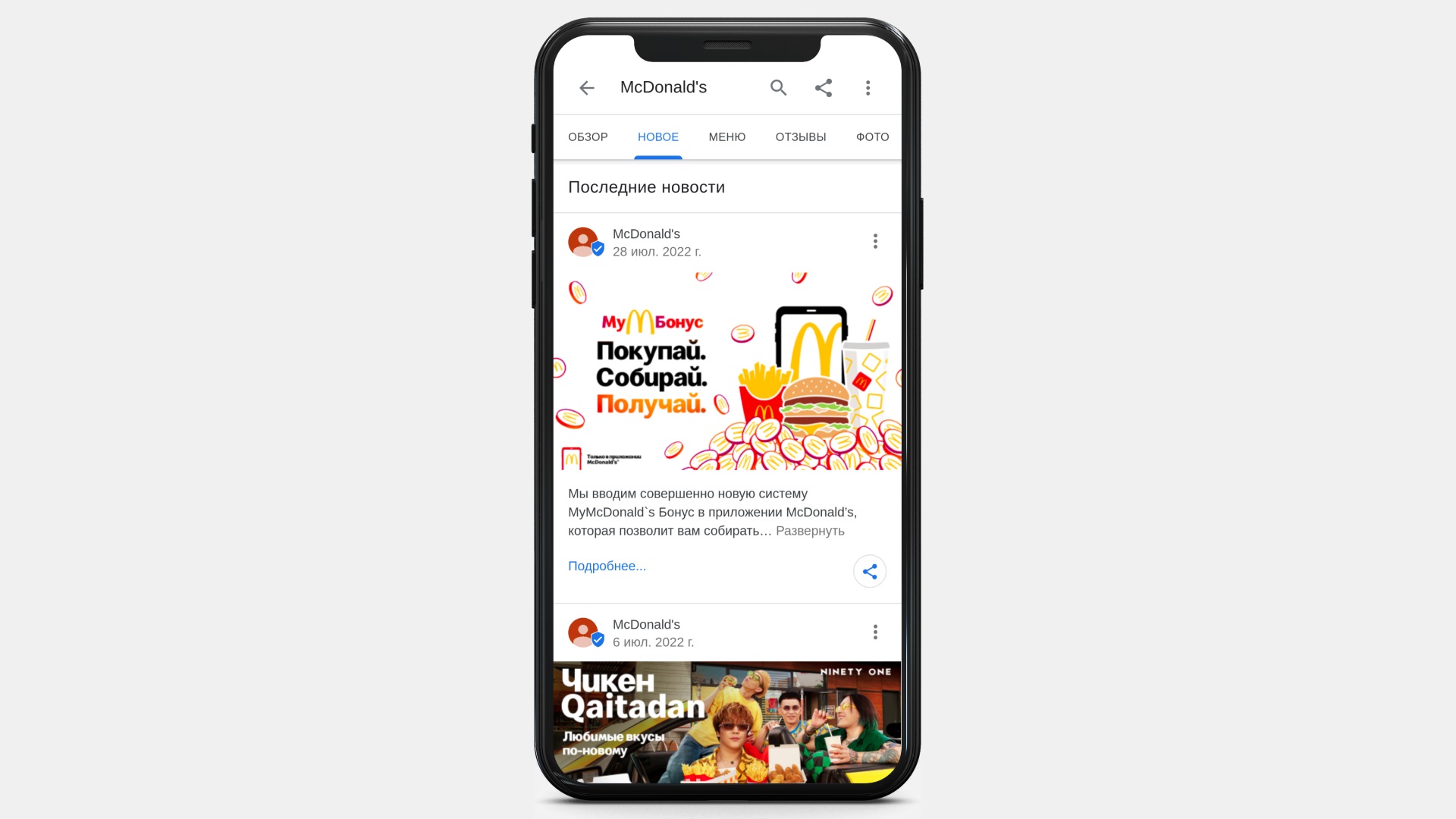 Так выглядит карточка сети фастфуда с постами в Google