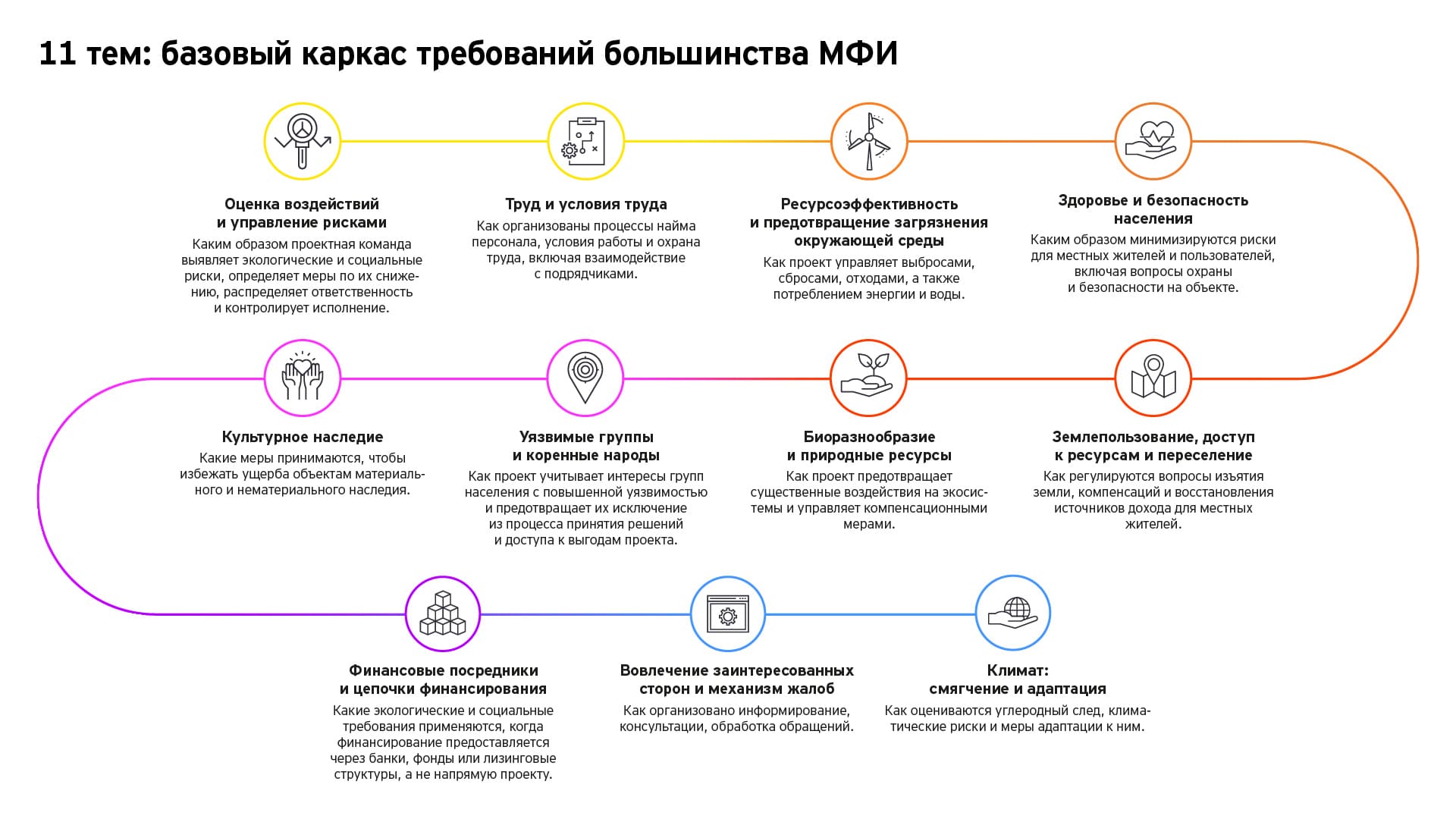 Если посмотреть на требования различных международных финансовых институтов в совокупности, то следует простой практический вывод: ядро системы управления E&S-рисками выстраивается один раз, а глубина исследований, набор планов и формат отчётности настраиваются уже под требования конкретного финансового института и условия финансирования.