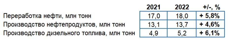 Давайте посмотрим на данные по переработке нефти в РК в 2021-2022 гг.: