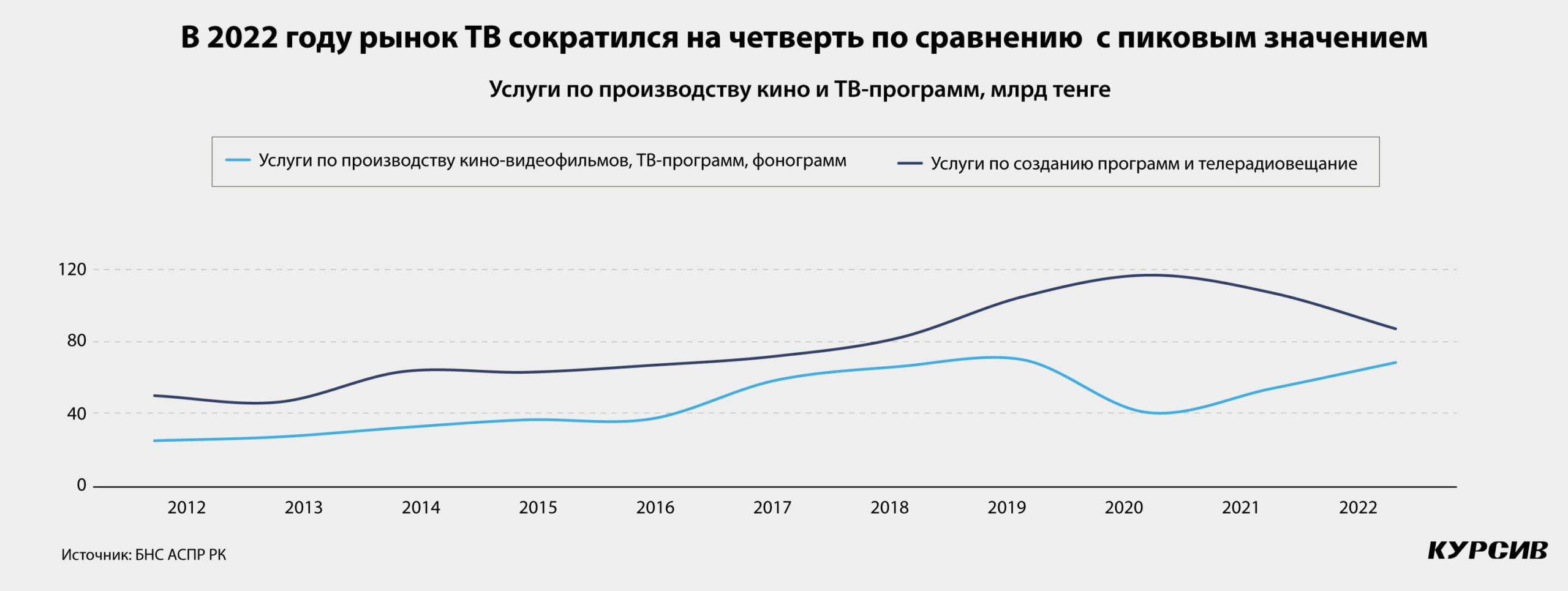 На этом фоне казахстанский рынок телевидения и кино переживает трудности. Официальная статистика РК фиксирует спад объема «услуг по созданию программ и телерадиовещания» – с 117 млрд тенге по итогам 2020 года до 87,2 млрд тенге по итогам минувшего года. При этом сами участники рынка не подтверждают эту тенденцию: по их оценкам, объем продакшна растет, правда, пока умеренными темпами.